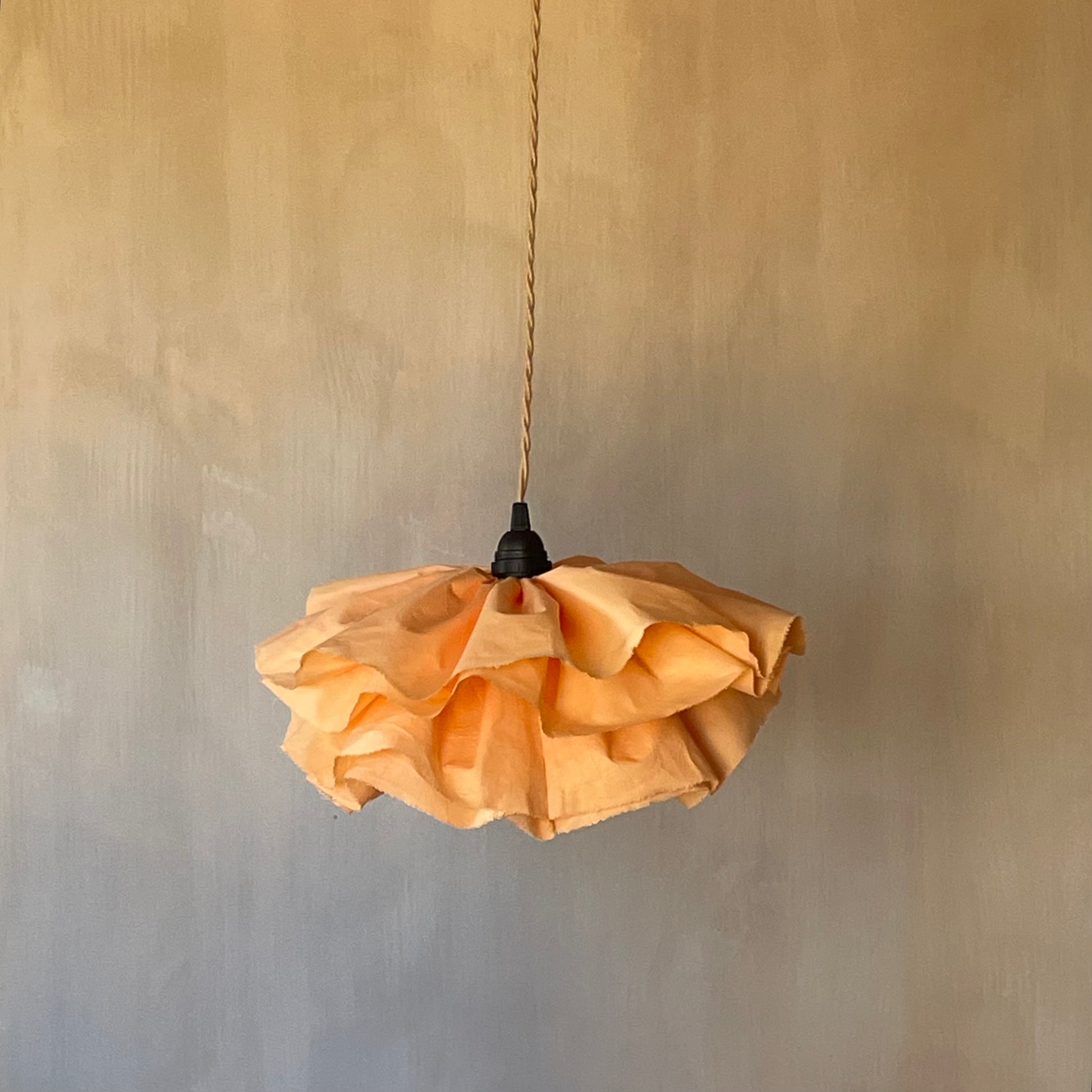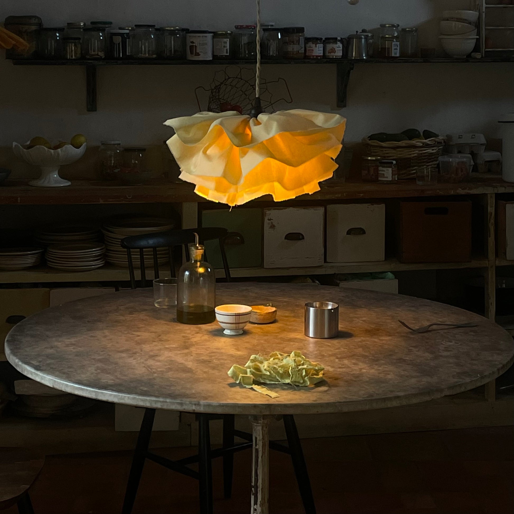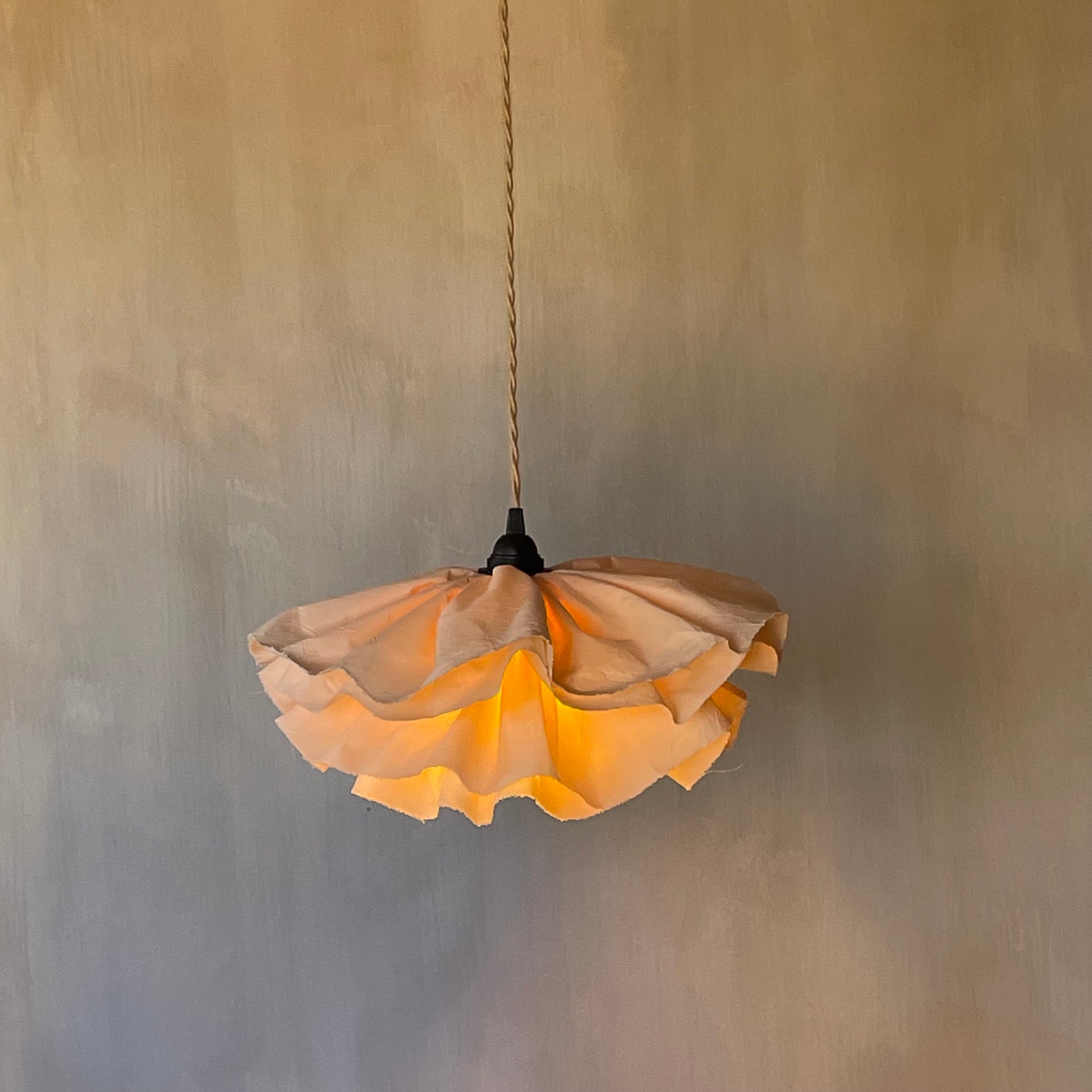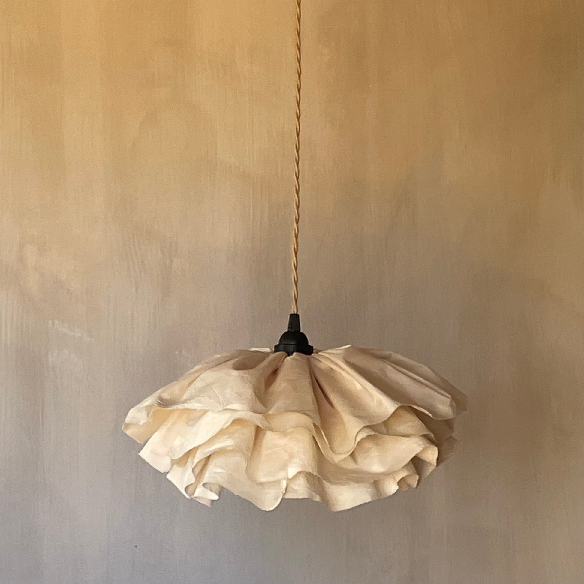 Lámpara colgante a base de pliegues que difuminan la luz de manera sutil.