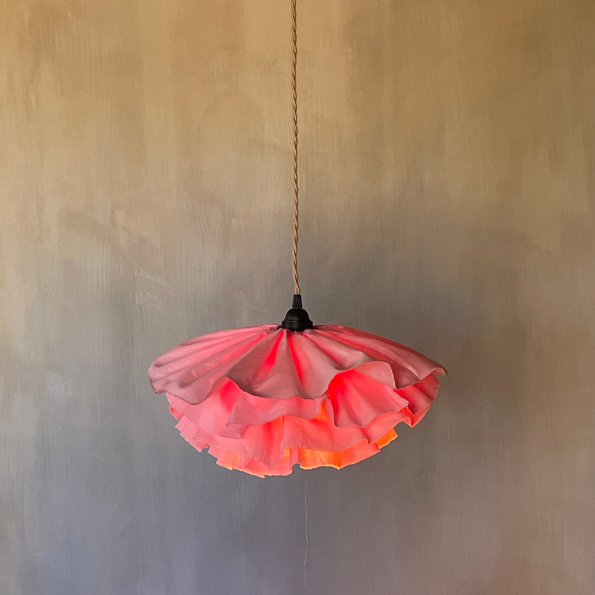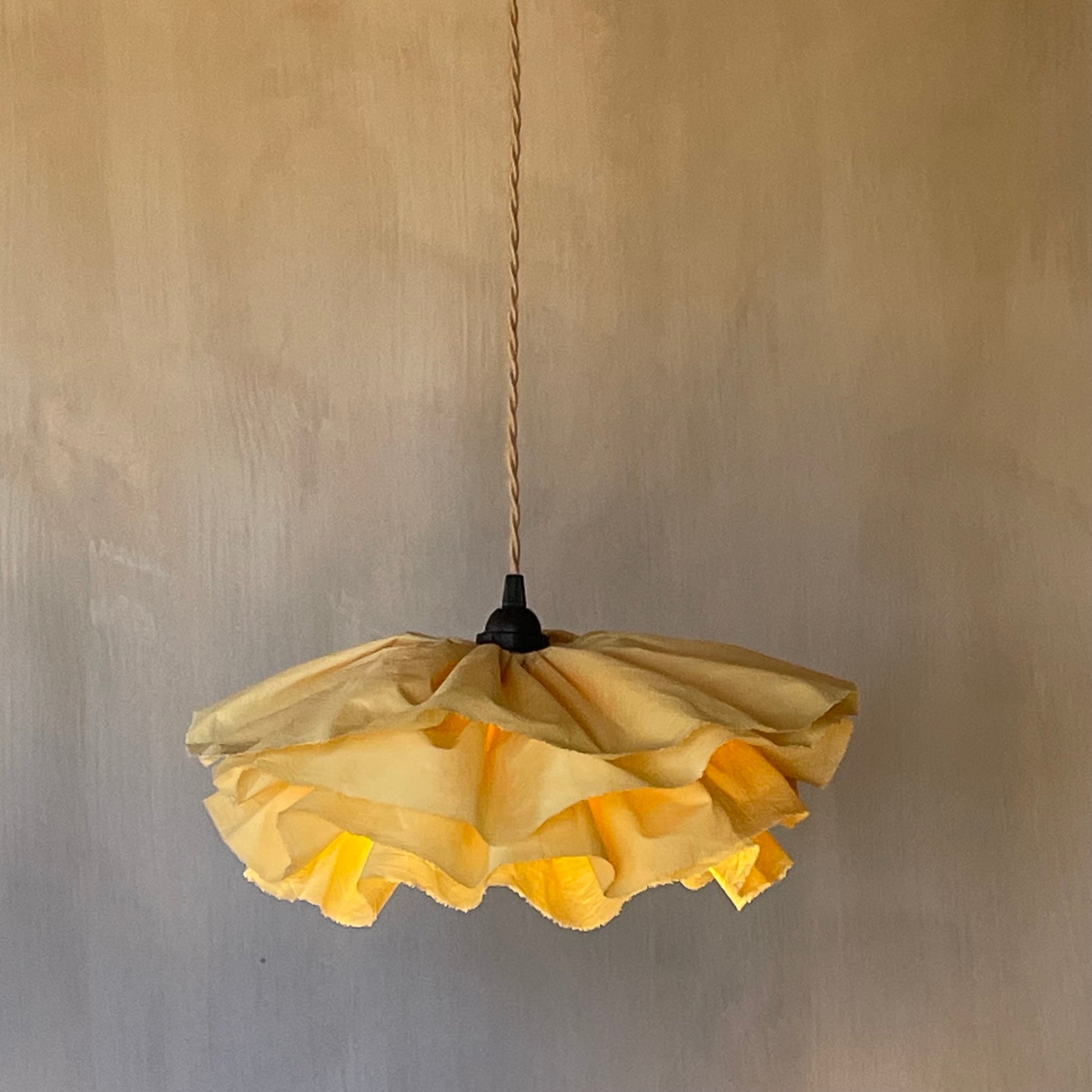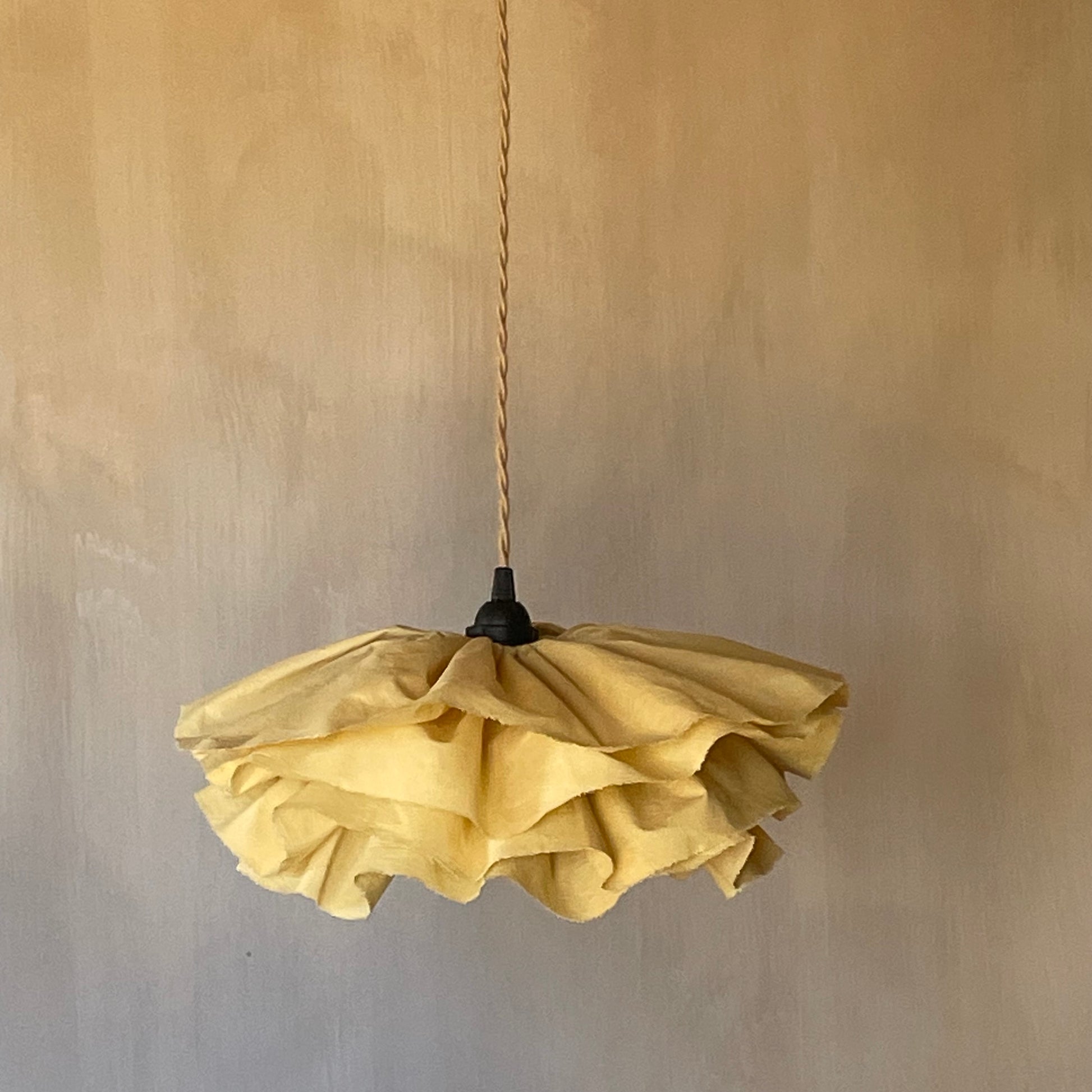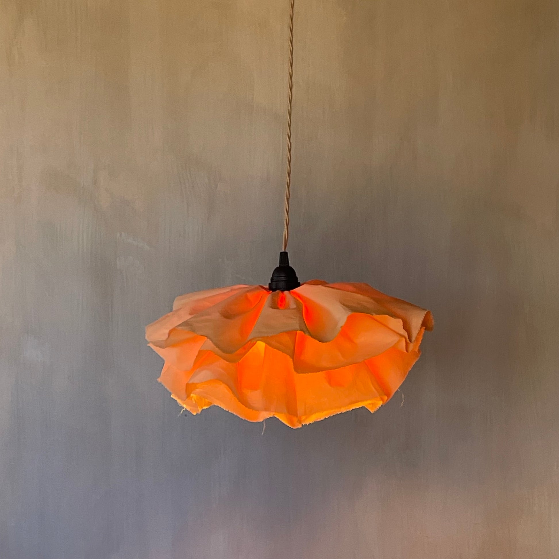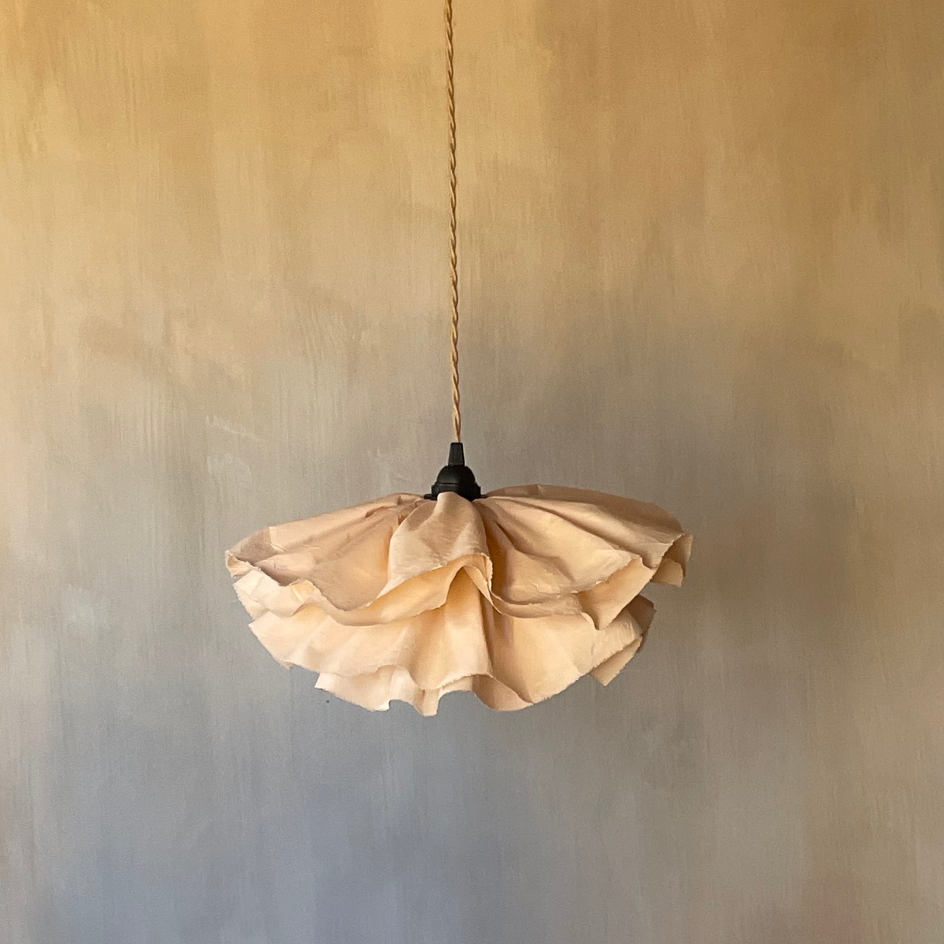 Lámpara colgante a base de pliegues que difuminan la luz de manera sutil.