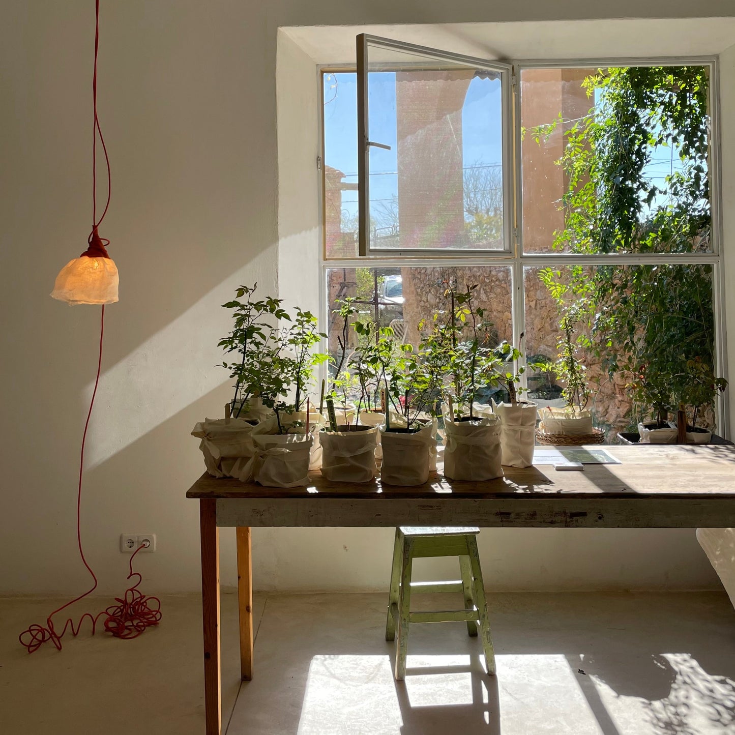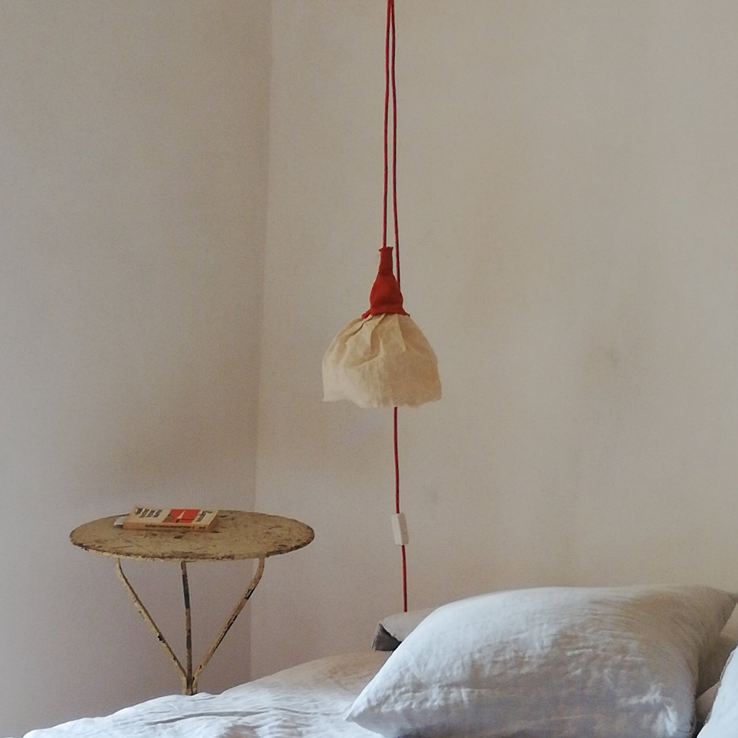 Lámpara suspendida con diseño floral. El cable se sujeta al techo mediante un soporte textil que permite ajustar la altura de la pantalla según preferencias. Fabricada con pantalla de gasa de lino adherida y cáliz de algodón panamá en tonalidad teja. Estructura interior reforzada con recubrimiento de cinta para mayor durabilidad y estabilidad.