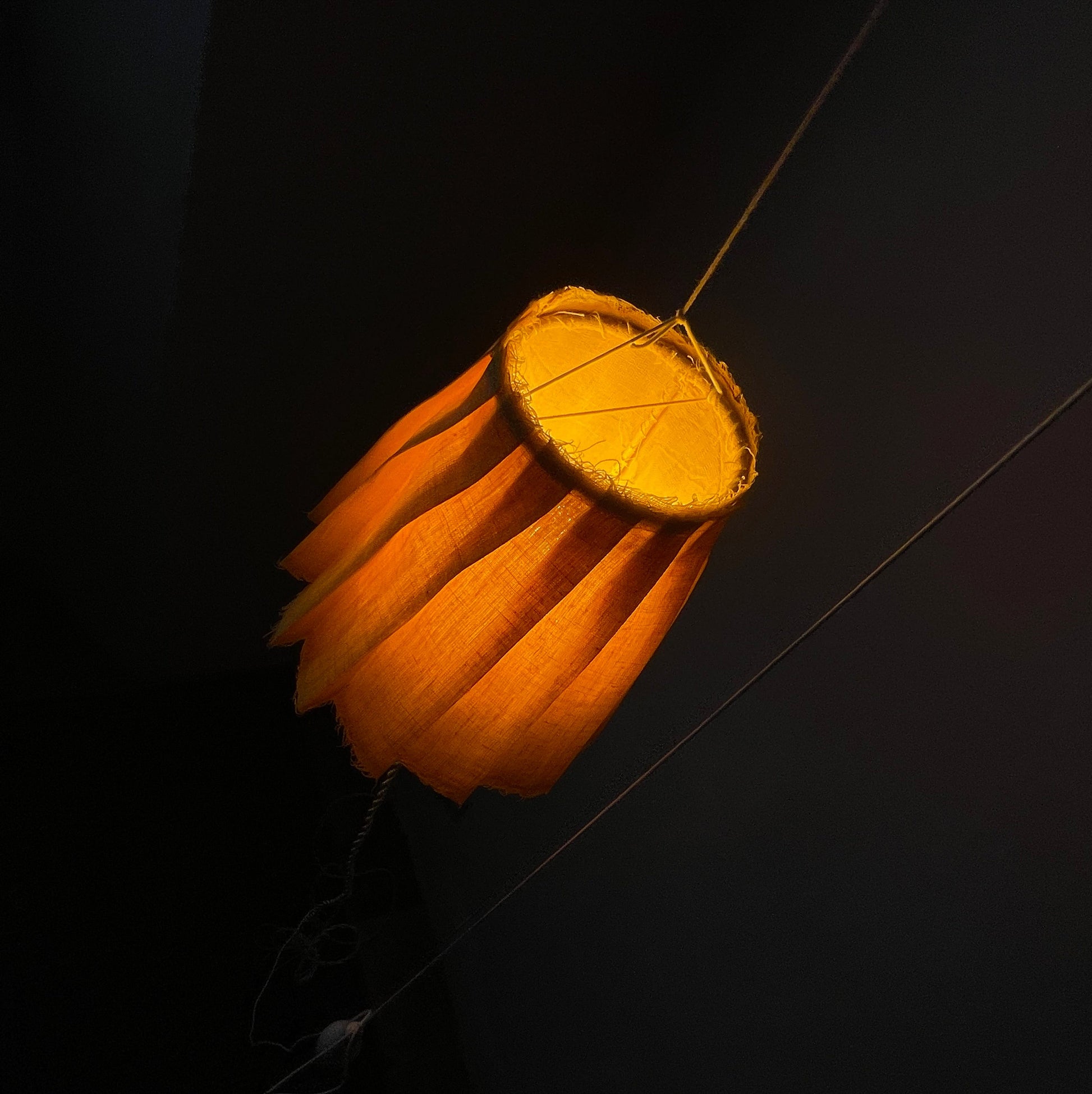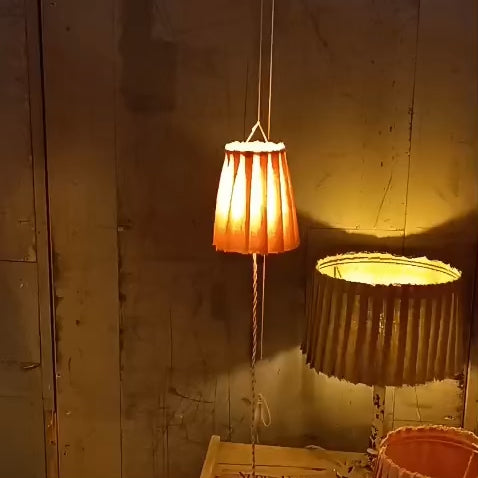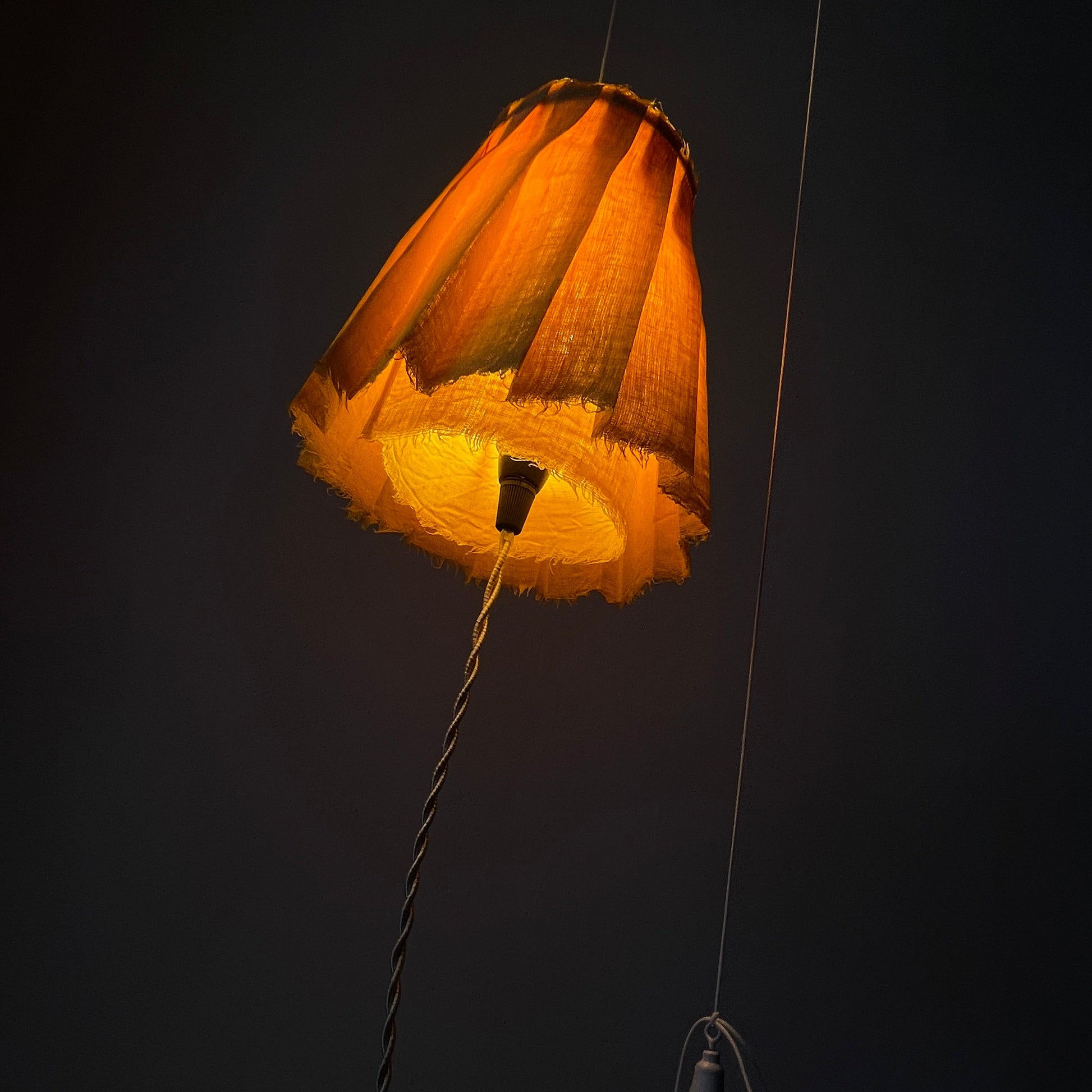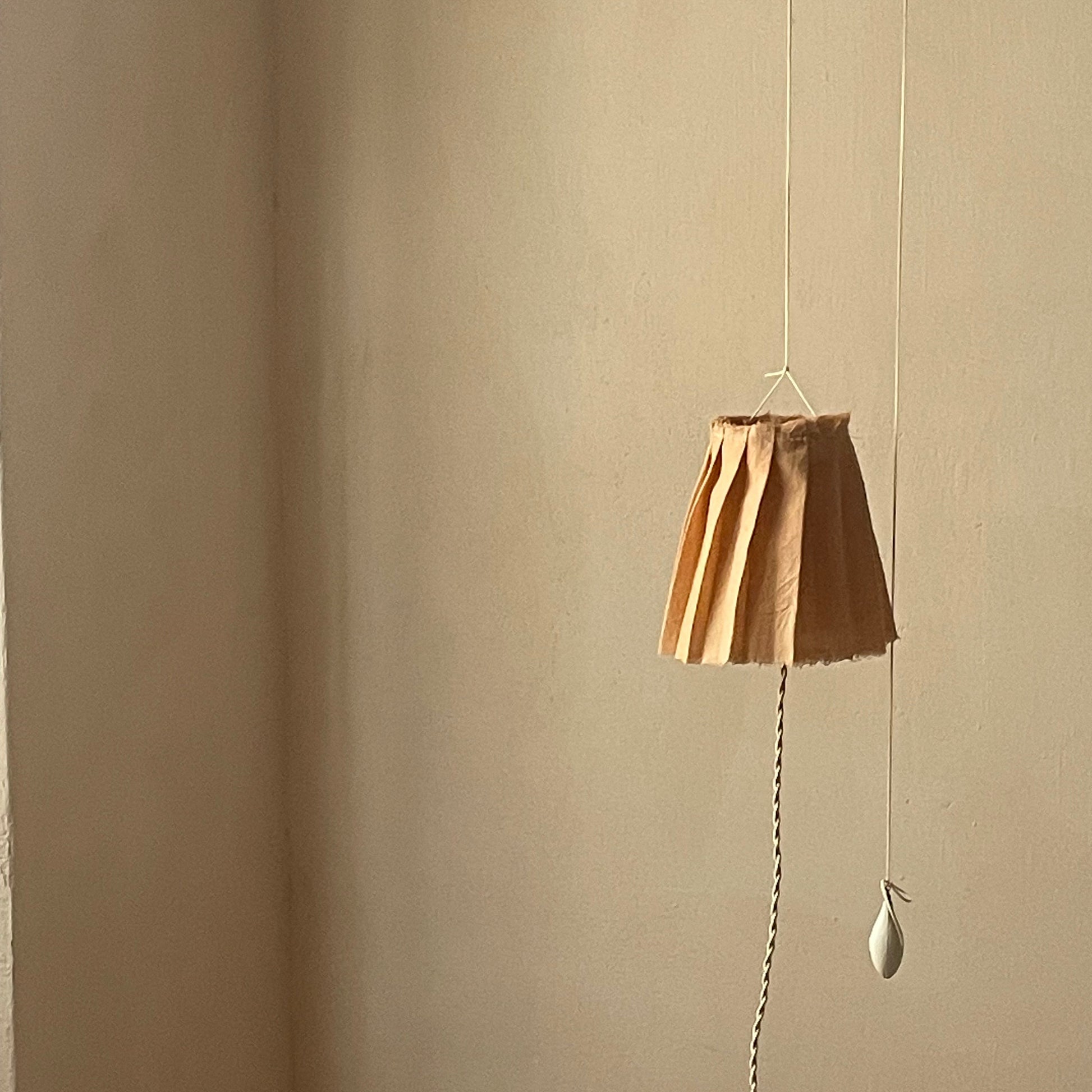 Pantalla MUFFIN sostenida por una fina cuerda de algodón encerado. Un contrapeso permite el desplazamiento vertical de la pantalla. Su mecanismo de contrapeso garantiza estabilidad y facilidad de uso, permitiendo modificar la altura y la intensidad lumínica con un simple movimiento.