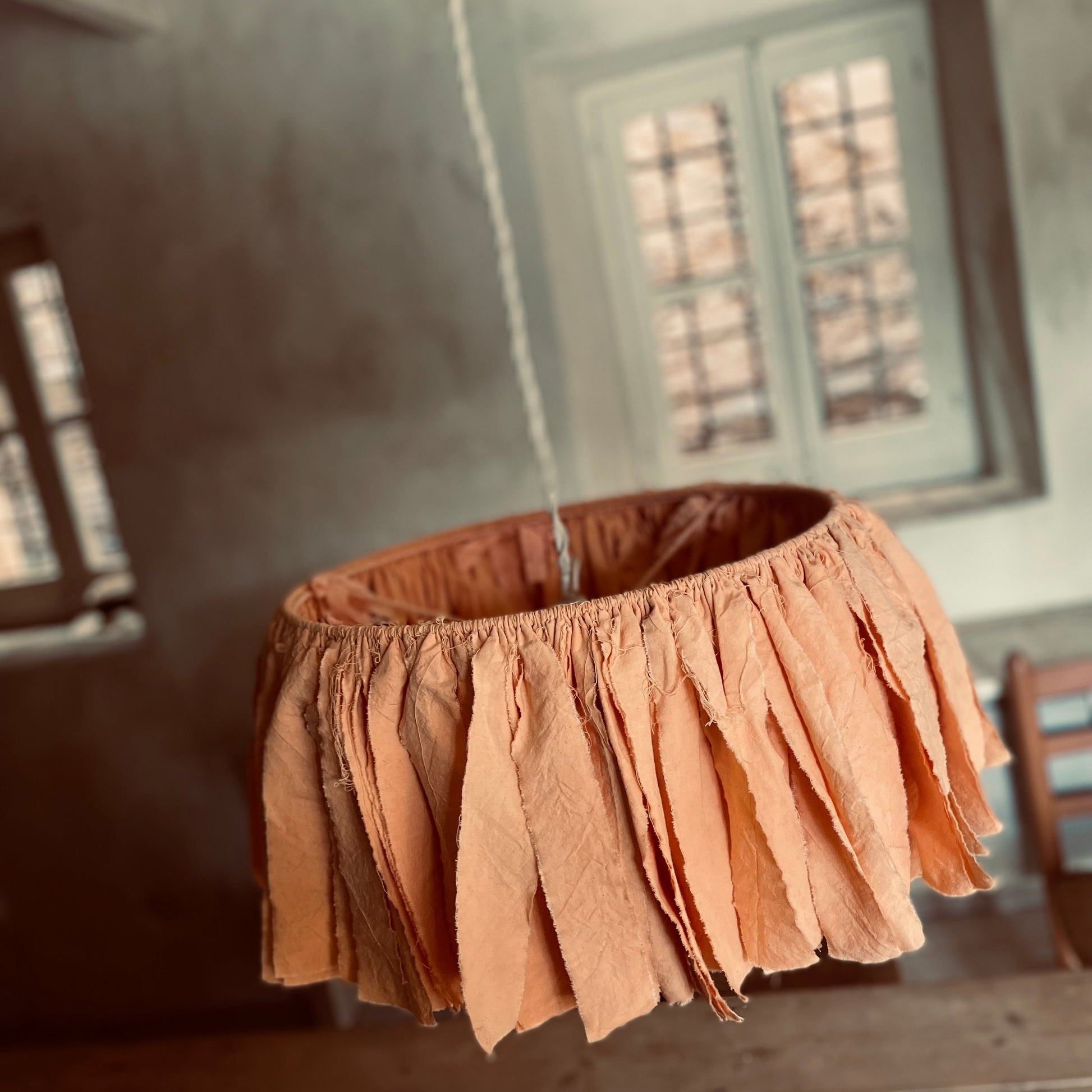 Elaborada con doble capa de algodón, la pantalla presenta un interior liso contrastado con un exterior de tiras rasgadas. La interacción entre el tejido y la luz crea una atmósfera excepcionalmente cálida. La estructura metálica queda elegantemente revestida con el mismo tejido de la pantalla.