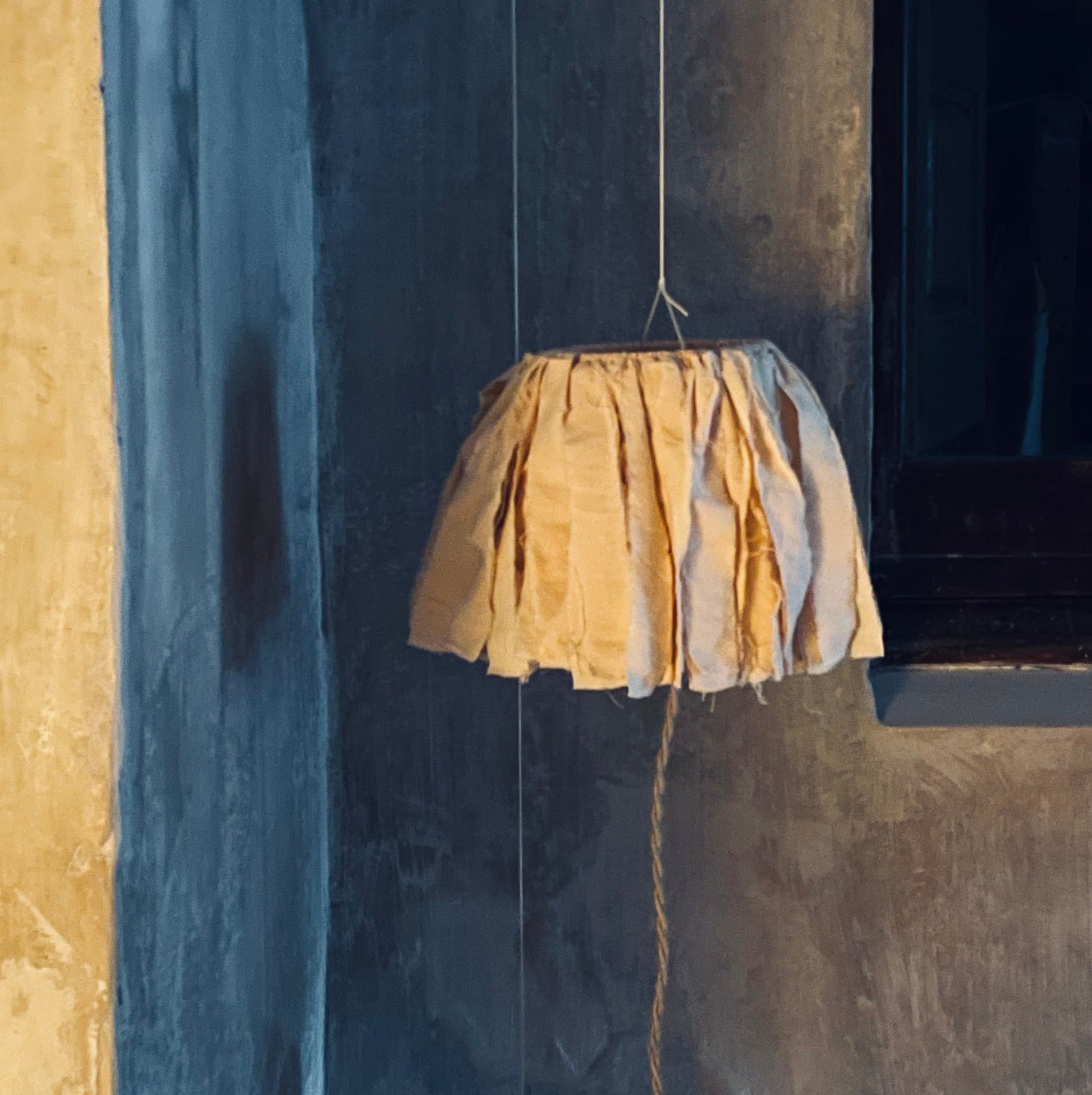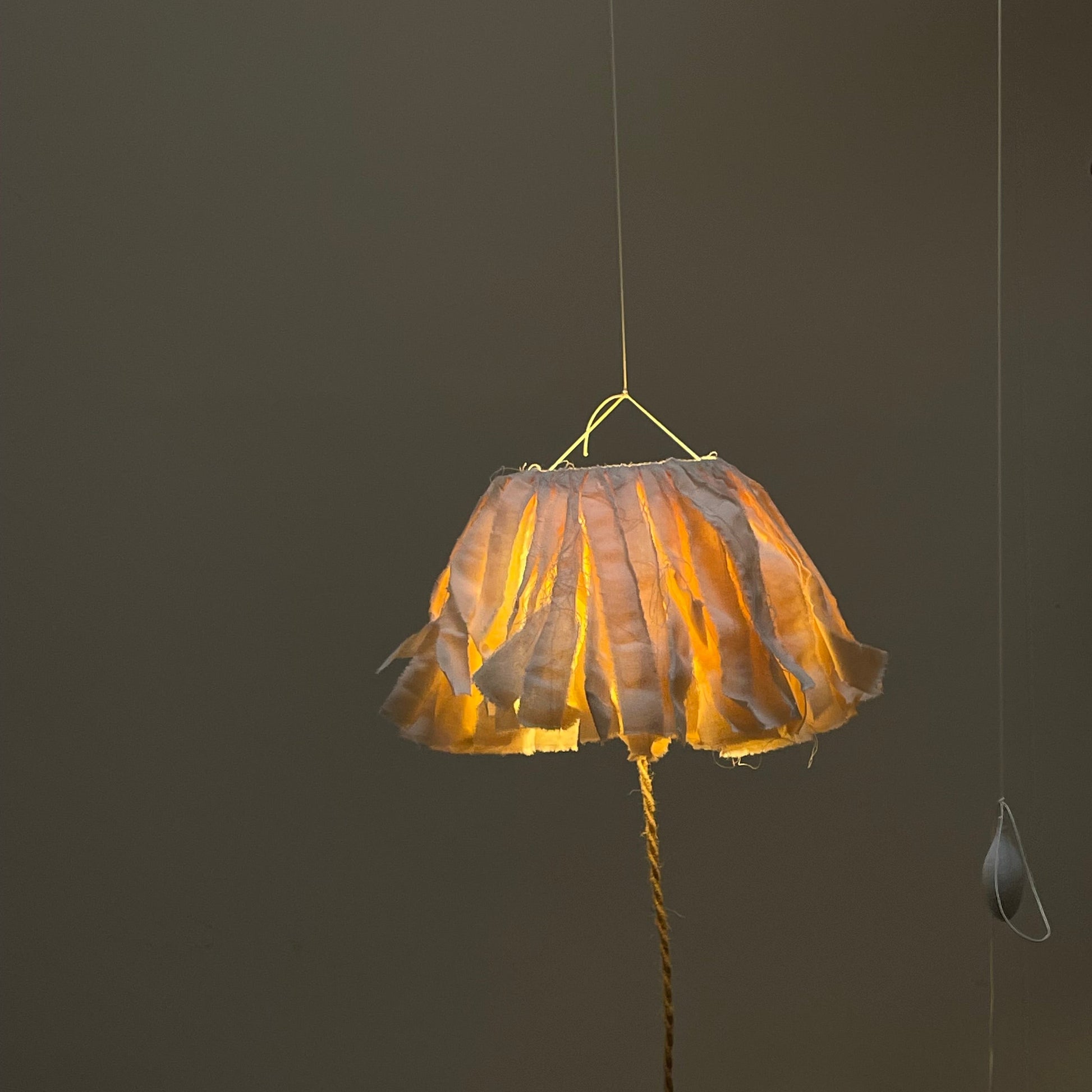 Elaborada con doble capa de algodón, la pantalla presenta un interior liso contrastado con un exterior de tiras rasgadas. La interacción entre el tejido y la luz crea una atmósfera excepcionalmente cálida. La estructura metálica queda elegantemente revestida con el mismo tejido de la pantalla.