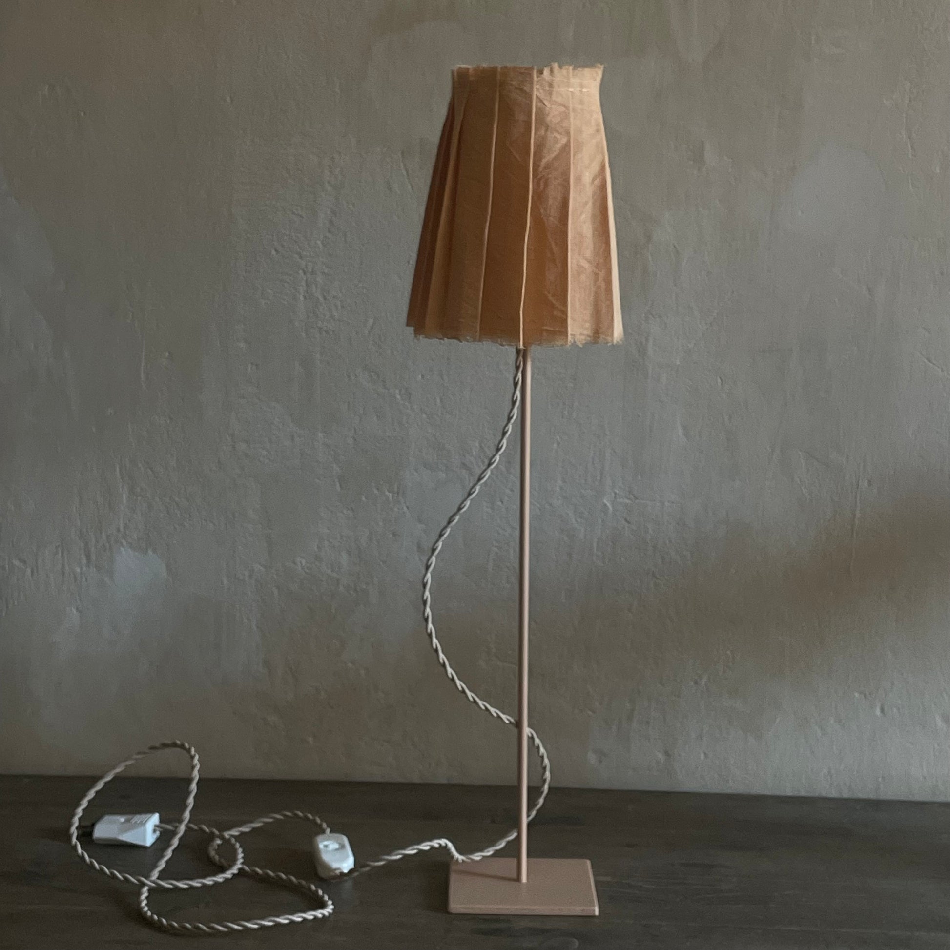 Lámpara con base de hierro pintado y pantalla de tela de lino modelo MUFFIN. Disponible en blanco roto y rosa salmón.